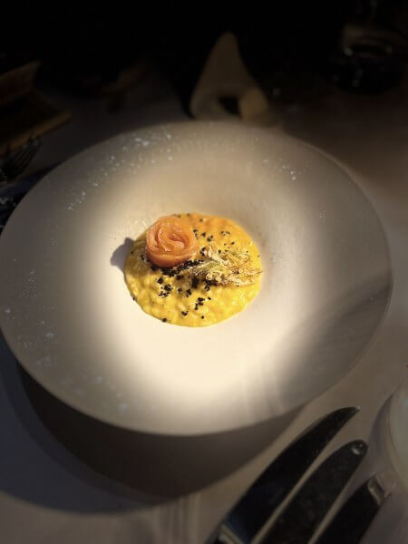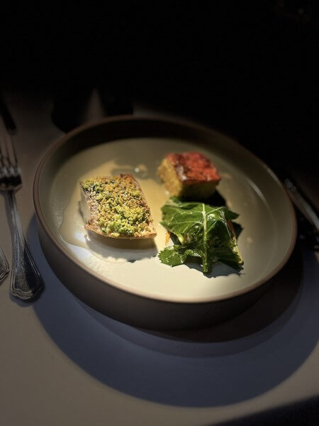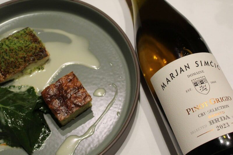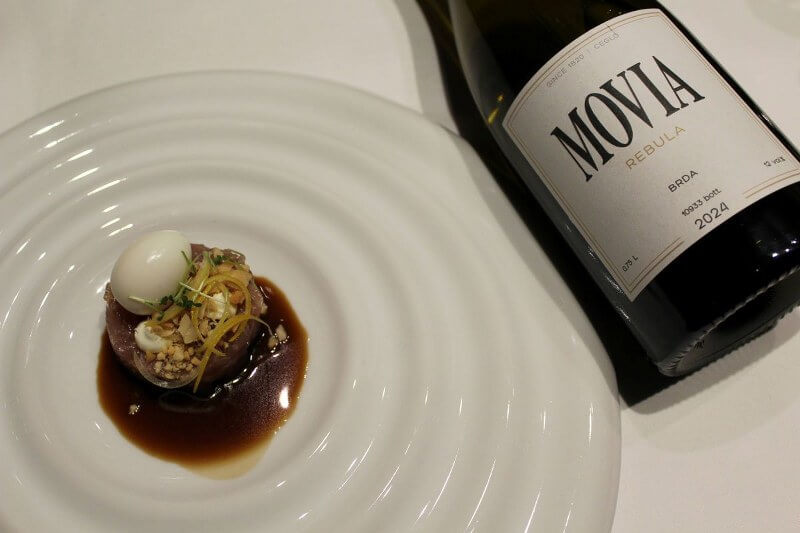 Uzvanike je na stolu dočekao zalogaj od telećeg hrpta sa sirom, ukiseljenim lukom te domaćim kruhom i maslacem s dimljenom soli i maslinovim uljem Lisjak iz slovenskog dijela Istre, a u čaši Sauvignon 2024. vinarije Kozinc. To je vino popratilo i početak prave večere: carpaccio od cikle s moussom od gorgonzole, krekerima od timijana i pečenim pinjolima. Uslijedio je tatarski od tune sa soja umakom, prepeličjim jajetom i kikirikijem te Movia Rebulom 2024. s Goriških brda Aleša Kristančiča.