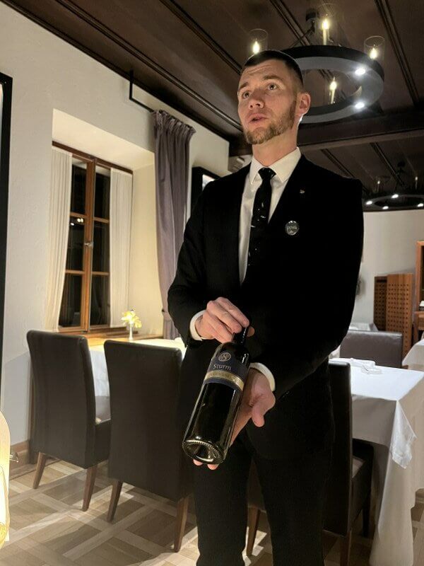 Domaćini Mojca Grill i Matej Jordan priču su započeli pjenušcem u Wine Toweru, ekskluzivnom kružnom prostoru za degustacije u koji stane 15-ak ljudi. Domaine Slapšak Brut Nature penina je proizvedena klasičnom šampanjskom metodom od chardonnaya, crnog pinota i autohtone slovenske sorte žametna črnina. Od potonje je i najstariji trs na svijetu, popularno zvan stara trta, koji više od četiri stoljeća živi u Mariboru, a presađen je i u dvorište Grada Otočca. Beru grožđe s tog trsa i rade vino.