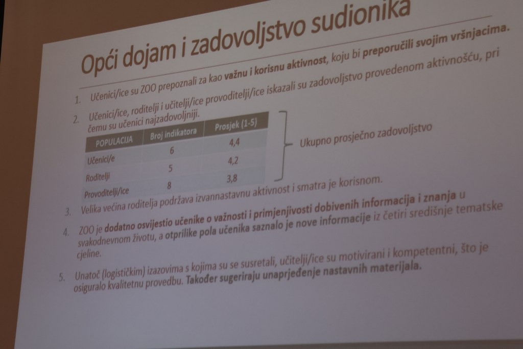 Slijedilo je predstavljanje rezultata istraživanja prve godine provedbe, koje je pokazalo visoku razinu zadovoljstva i interes učenika, nastavnika i roditelja. Pilot fazu programa učenici su ocijenili s 4,4; roditelji s 4,2, a nastavnici-provoditelji ocjenom 3,8. Istraživanje su proveli Tanja Jurin i Goran Kolatić s Filozofskog fakulteta u Zagrebu te Tatjana Čulina iz Nastavnog zavoda za javno zdravstvo PGŽ. Uz veliku razinu potpore, uočene su i poteškoće u organizaciji rasporeda te dostupnosti terenske nastave. Preporuke su vizualno modernizirati i konkretizirati radne materijale, ojačati suradnju škola s udrugama i institucijama te uključiti roditelje, uz naglasak na dugoročne koristi.