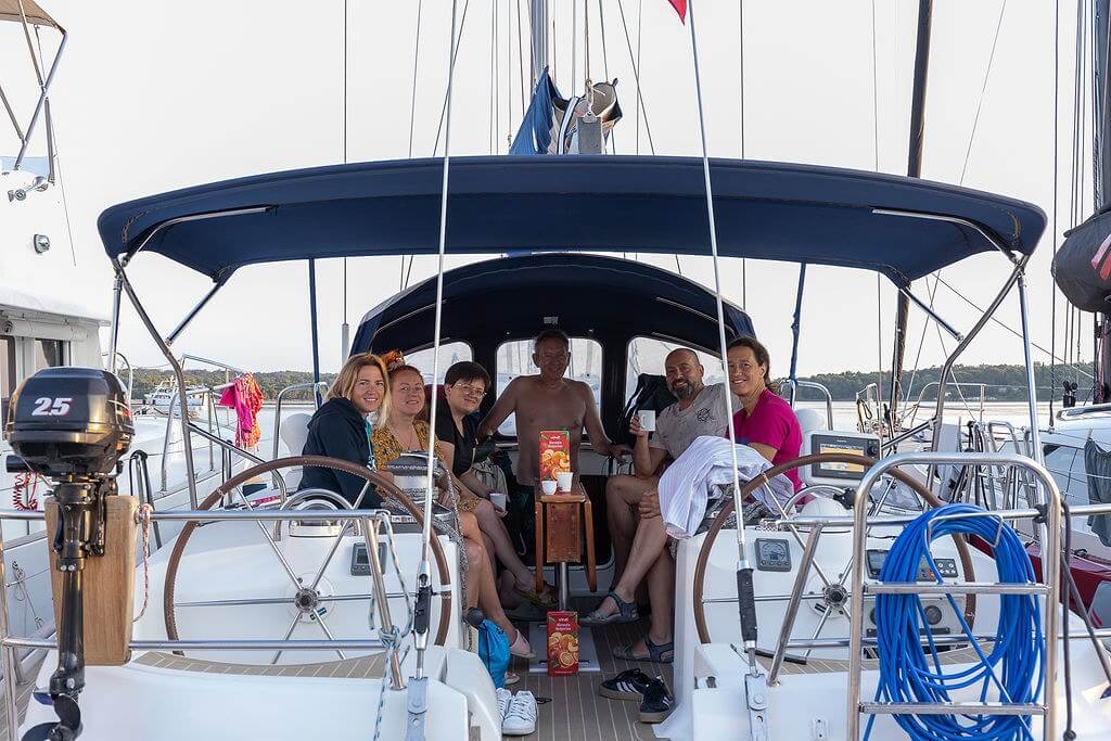 Dizanje uglavnom oko 5.00, najčešće Kas kuha kavu, skiper nas izvozi s pristaništa dok svi polako bauljamo iz potpalublja. Ja se rastežem i navlačim neopren, mažem vazelin na bitne točke, dolazimo na mjesto gdje smo prošli puta stali i Kas pali mobitel za live prijenos. E, tu smo zeznuli, trebalo je to drugačije organizirati da vidi više ljudi, ali uvijek možete pogledati snimku. Bila je i ideja da se jedan mob pričvrsti i stalno bude live, ali nije dočekala izvedbu. Plivalo se prosječno dnevno oko 6.000 metara, kad se plivalo, bilo je dovoljno dana za odmor i prisilno stajanje zbog vjetra i kiše dok smo bili u Novigradu. Hvala Garminu što je prikupio statistiku, ali kako bih nekad zaboravio stisnuti start, a češće zaboravio ugasiti nakon plivanja, točna brojka preplivanog – nije baš najpreciznija.