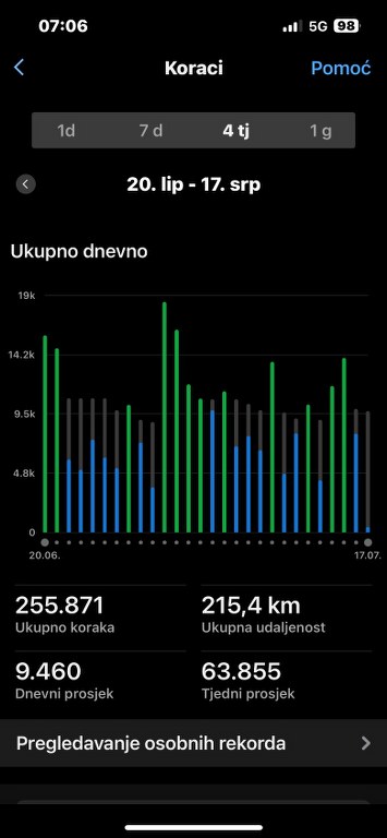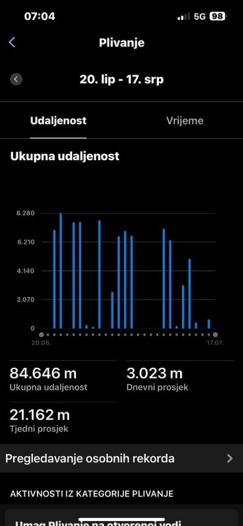 Uz prosječnih pedesetak kilometara na Bazenu Utrina (ulaznica je 4 eura, skupo, ali nema izbora – svaki put kad bih uzeo mjesečnu, odmah bih se i potrgao…), zadnji mjesec sam išao i u teretanu Gyms4You, sat vremena hodanja na traci na uzbrdici plus 15 minuta ergometra uz gledanje vesterna na HRT2. Trideset i nešto eura mjesečno, uzeo na šest mjeseci i više nisam otišao, panj… Uz to, svakoga dana barem dvije šetnje s Dživom, i nije neki trening, ali sam na zraku, tako da je mjesečni prosjek oko 10.000 koraka dnevno. Prije plivanja sam se bio stesao na 98 kila, od stresa s papirologijom i pakiranjem sam počeo žderati i krenuo plivati s cca 99,5. vaga se na brodu malo ljuljala, pa nisam siguran u točnost, ali na kraju sam imao 97,8 kg …