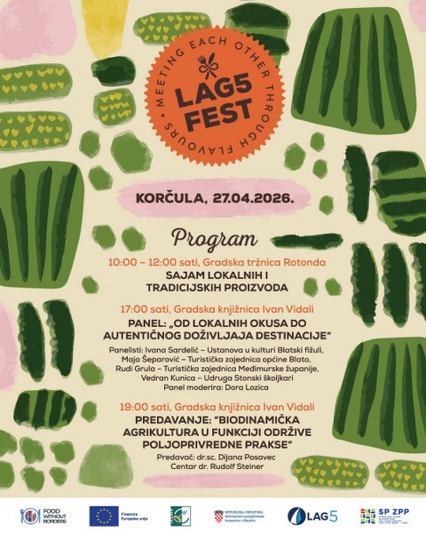 U ponedjeljak, 27. travnja 2026., od 10 do 12 sati, gradska tržnica Rotonda u Korčuli postaje središte susreta otočnih i europskih okusa kroz manifestaciju LAG 5 FEST. Događaj organizira Lokalna akcijska grupa LAG 5 u sklopu međunarodnog projekta “Food Without Borders”, s ciljem povezivanja ruralnih zajednica kroz gastronomiju, tradiciju i zajedničke vrijednosti.