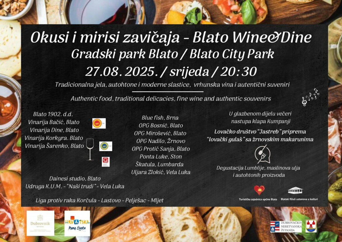 Završno ljetno izdanje prepoznatljive eno-gastro manifestacije „Okusi i mirisi zavičaja – Blato Wine&Dine“ čeka vas i ove srijede, 27.kolovoza od 20:30h u jedinstvenom ambijentu Gradskog parka u Blatu.