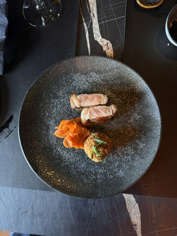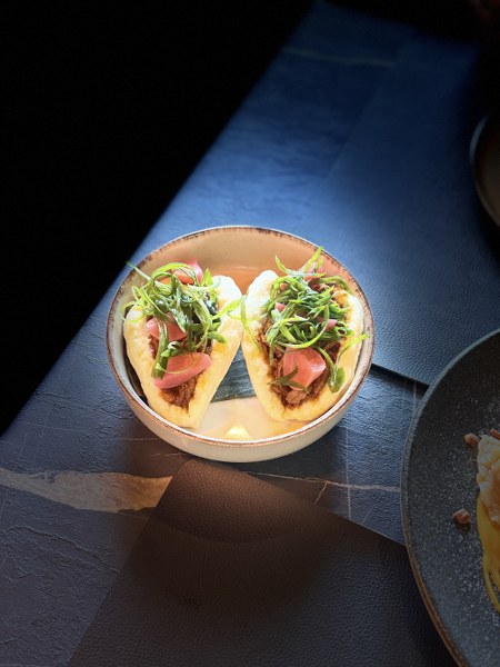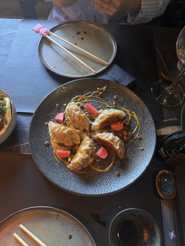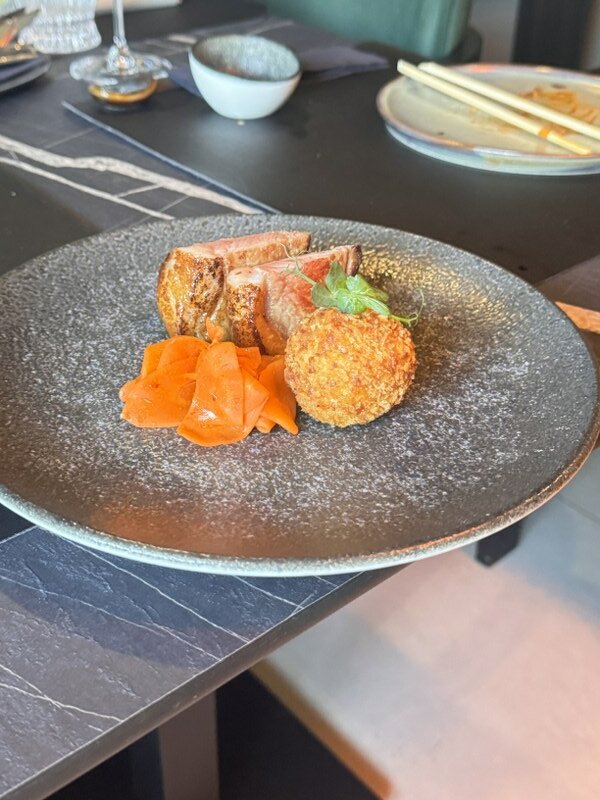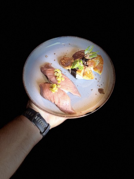 Imali smo priliku kušati jedan miks po izboru šefa kuhinje, od svega pomalo, s naglaskom na glavnim namirnicama koje idu najbolje u ovom trenutku. Odmah smo se razveselili sushiju, konkretno nježnom kosamakiju sa šparogom (!), klasičnom nigiriju s potrbušinom tune i fenomenalnom iznenađenju – speciality s gusjom jetrom! Sushija se (imaju i uramaki i sashimi) ne bi postidio niti jedan zagrebački restoran, a sve je tako jednostavno, bez suvišnih začina i dorada. Nastavak ove, mogli bismo reći, SlavonAzije dolazi s moćnim gyozama punjenim svinjskom lopaticom koje imaju okus kao ćevap u bijeloj košuljici, a zatim i s vrlo dobrim, ne predebelim ni preslatkim bao bunsima s janjetinom iz Širokog polja, njenim jusom, rotkvicama i algama.