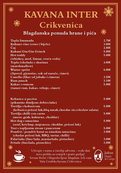 Adventski program u Crikvenici dodatno će obogatiti posebna događanja koja organiziraju Jadran hoteli d.d. U Boutique Hotelu Esplanade tijekom prosinca održavaju se plesni vikendi uz profesionalnog plesnog pedagoga Elia Bašana, kroz radionice standardnih i latino plesova namijenjene svim razinama plesača. Adventski duh širi se i u Kavani Inter, gdje 30. studenoga započinje adventski kalendar s dnevnim iznenađenjima te posebnom ponudom blagdanskih okusa, a 3. prosinca održava se i popularni PUB kviz — omiljeno adventsko druženje uz zabavu i dobru atmosferu.