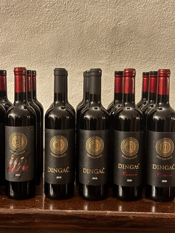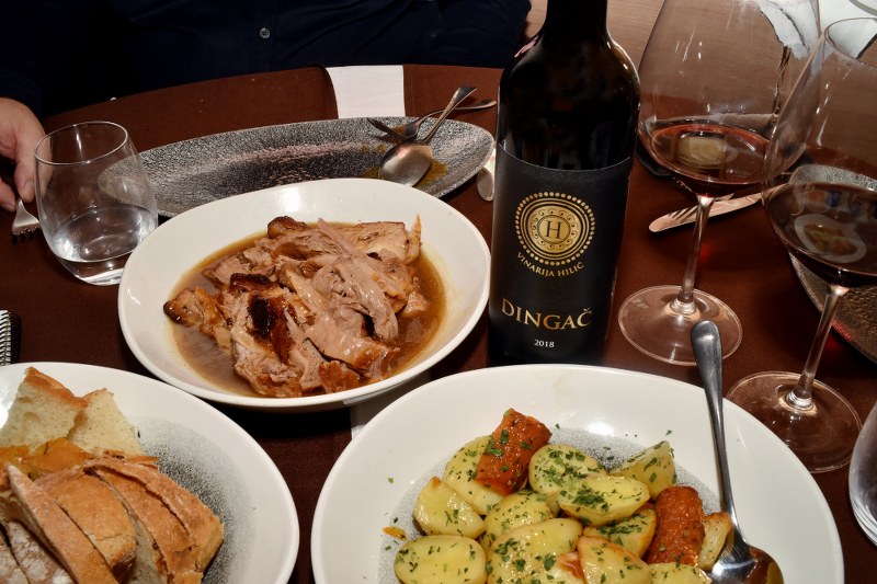 Plavac mali Zvir, 2022, vino je koje nastaje iz malog kunskog vinograda starog 35 godina, a dojmio se i svidio najviše gostima, kao i kad su ga pretpremijerno kušali 2022.godine i rezervirali u posebnoj, spontanoj akciji „En primeur“, čekajući ga do ovoga prosinca, kada je Alen Hilić odlučio da vino može izaći na tržište. Napunjen u boce tek prije desetak dana, relativno mlad (za plavac mali) ali već spreman za božićne i novogodišnje specijalitete. Voćan, a istodobno još pomalo divlji i rustikalan, a nekom skrivenom elegancijom koja neprimjetno opija. Visokih alkohola, stoga – oprezno s njime. Za prodaju je pripremljeno samo 1266 boca, zacijelo će ga brzo nestati – a ako se sačuva u podrumu, 5, 10 ili više godina, vjerujemo da će pokazati još kompleksnosti i dubine. Uz taj su plavac lijepo prijale tagliatelle s vrganjima i prženim pršutom. Potom su poslužena dva plavca s najpoznatijeg pelješkog vinskog položaja – Dingača, strmoga položaja s južne strane poluotoka, koji je, prvo „čuveno“ vino u Hrvatskoj, zaštićeno zakonom šezdesetih godina prošloga stoljeća.